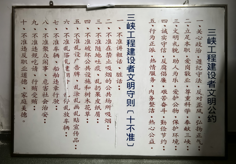 在三峡坝区右岸的三峡工程博物馆里,一块陈旧的铁皮板上,自右至左整整齐齐书写着《三峡工程建设者文明公约》和《三峡工程建设者文明守则》(以下简称“一五一十”文明公约),白底红体,共15行,200余字,言简意赅却又直击人心。