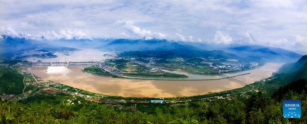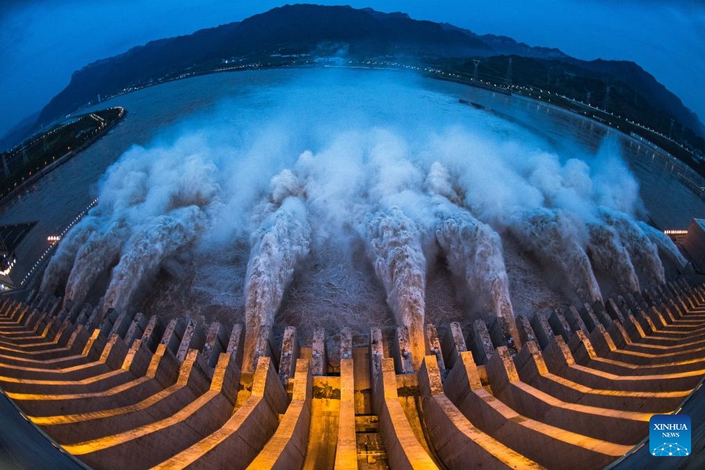 This photo taken on Aug. 19, 2020 shows water gushing out from the Three Gorges Dam in central China's Hubei Province. The Three Gorges project, the world's largest hydropower project, has generated over 1.7 trillion kWh of electricity. It marked the 30th anniversary of its construction on Saturday.(Xinhua/Xiao Yijiu)