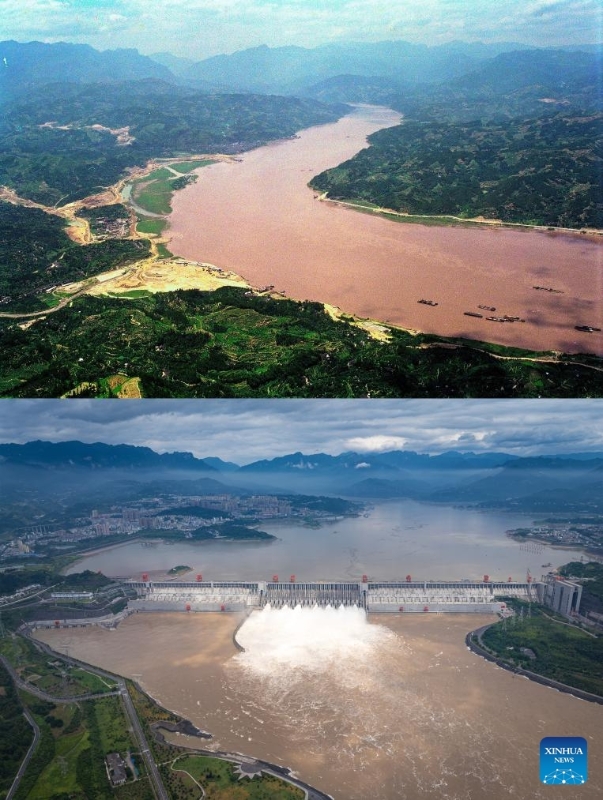 Combo photo shows the site of the Three Gorges Project (top) taken by Huang Zhengping in 1993, and the Three Gorges Dam taken by Xiao Yijiu in central China's Hubei Province, on July 20, 2024. The Three Gorges project, the world's largest hydropower project, has generated over 1.7 trillion kWh of electricity. It marked the 30th anniversary of its construction on Saturday.(Xinhua)