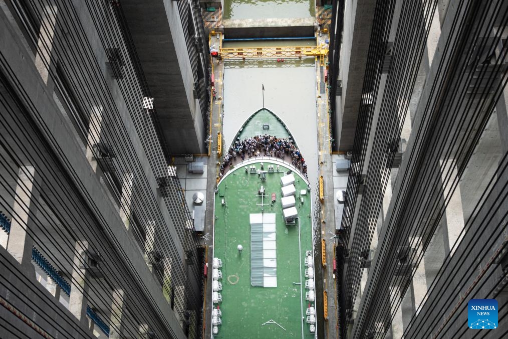 A vessel passes the ship lift of the Three Gorges project in central China's Hubei Province, July 20, 2024. The Three Gorges project, the world's largest hydropower project, has generated over 1.7 trillion kWh of electricity. It marked the 30th anniversary of its construction on Saturday.(Xinhua/Xiao Yijiu)
