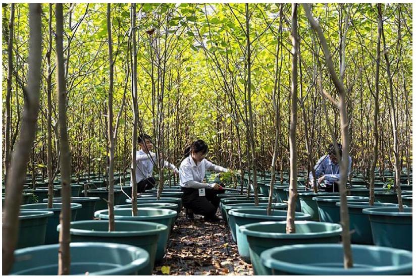 Scientists remove weeds from nursery pots holding Davidia involucrate in the nursery base of the Endangered Plants Institute of the China Three Gorges Corporation, on August 6, 2020. (XIANG HONGMEI)