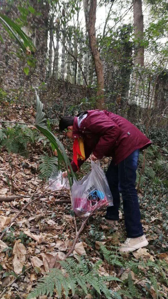 女儿在公园收集垃圾