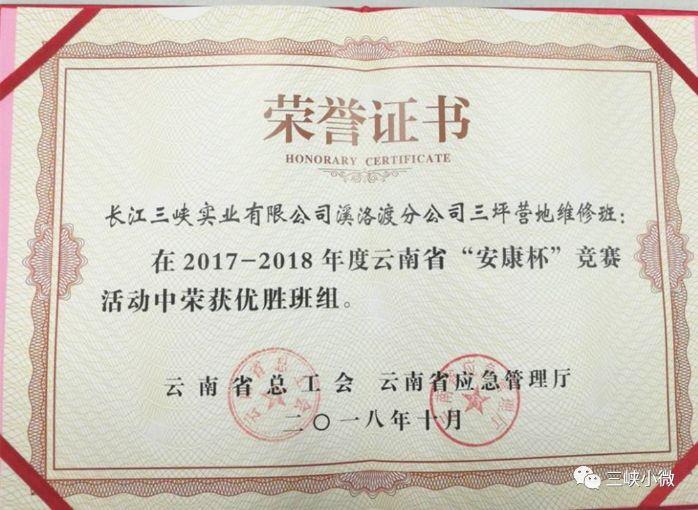 本网讯(胡建)2月18日,三峡基地公司实业公司溪洛渡分公司传来喜讯,在云南省总工会、云南省应急管理厅举办的2017—2018年度“安康杯”竞赛中,分公司三坪营地维修班被评为“优胜班组”。