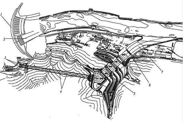 萨扬舒申斯克水电站,俄罗斯最大水电站。位于叶尼塞河上游。除发电外,有航运效益,控制流域面积18万平方千米。年径流量467亿立方米。基岩为 坚硬的结晶片岩。混凝土坝最大坝高245米,坝顶长1066米,是世界最高的重力拱坝。坝体混凝土量850万立方米,居世界大坝坝体混凝土量之冠。总库容 313亿立方米。坝后式厂房内安装原苏联设计制造的最大水轮发电机组,单机容量64万千瓦,总装机容量640万千瓦,年发电量235亿千瓦·时。溢洪道设 计泄量13600立方米/秒 , 具有世界上落差最大的水跃消能设施。