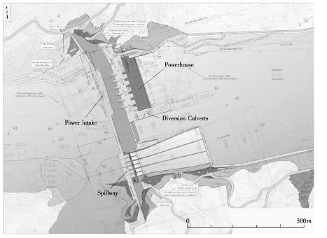 工程于2005年底开工。施工期设计流量为21000m3/s,分4期导流,采用河床及位于电厂右侧2个12m13m的涵洞导流。大坝碾压混凝土于2008年1月开始浇筑,2010年8月底全部完工,最高月浇筑量为20万m3。首台机组于2011年1月投产发电,当年4台机组投产运行,2012年10月实现6台机组全部投产发电。