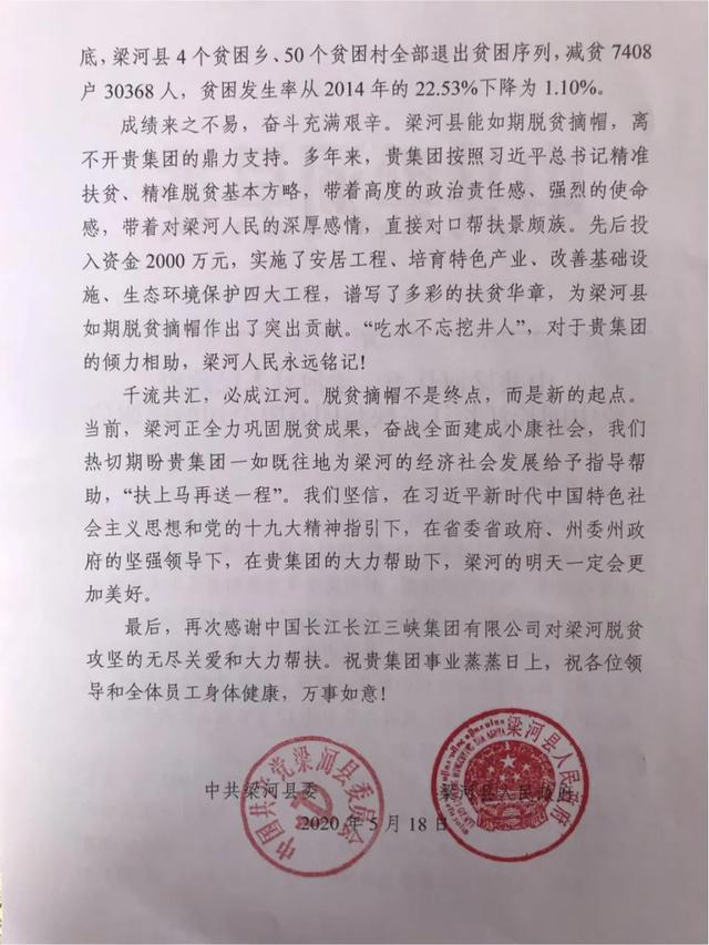梁河县在致三峡集团的感谢信中表示,三峡集团带着高度的政治责任感、强烈的使命感,带着对梁河人民的深厚感情,直接对口帮扶景颇族人民,实施安居工程、特色产业培育、基础设施改善、生态环境保护等四大工程,谱写了多彩的扶贫华章,为梁河县如期脱贫摘帽做出突出贡献。