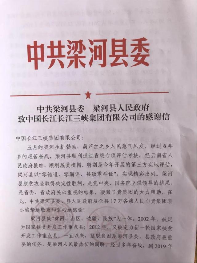 本网讯(彭宗卫)6月5日,三峡集团收到云南省德宏州梁河县委、县政府发来的感谢信,梁河县对三峡集团多年来在景颇族群众脱贫攻坚中给予的无尽关爱和倾力帮扶表示感谢。