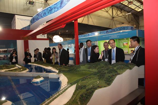 | 韩国环境部官员在三峡模型前与三峡集团参展人员交流。(刘华 摄) |
