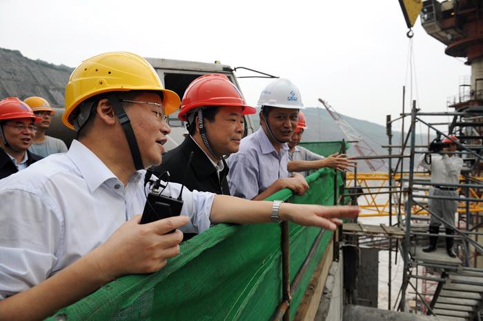 会议期间,陈飞深入向家坝工地,检查了左岸缺口坝段闸门及启闭系统准备情况,观看了向家坝同步闸门下放监控系统,并随后检查了左岸电站机组安装和厂房装修、左岸大坝建设、右岸电站首批机组安装和调试等下闸准备工作。