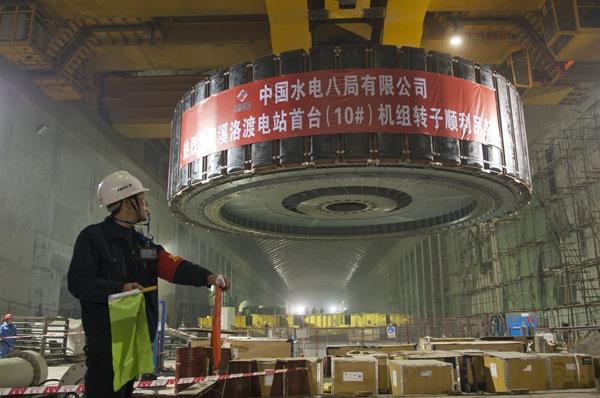 溪洛渡水电站首台水轮发电机组转子吊装就位