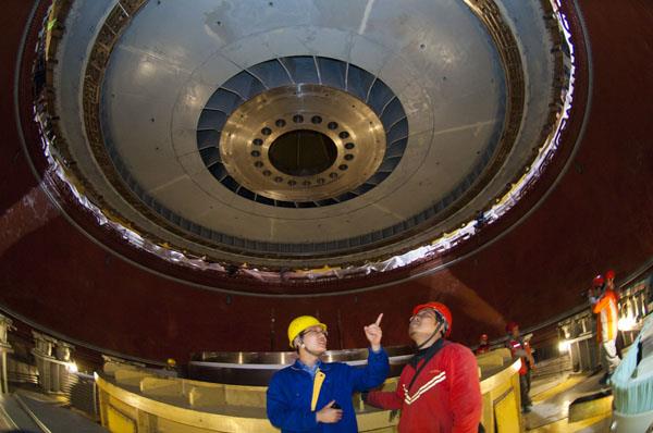 | 溪洛渡水电站首台转子(10号机)3月1日吊装就位。王连生摄 |