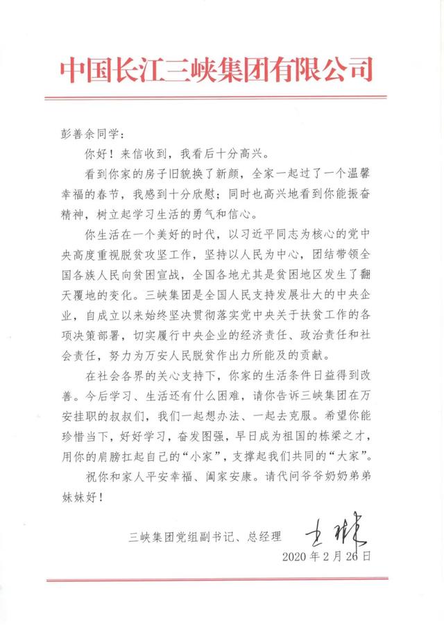 本网讯(喻清卿)近日,江西省万安县弹前中学九年级学生彭善余收到一份特殊的礼物——一封来自三峡集团党组副书记、总经理王琳的回信,王琳在回信中对彭善余一家生活条件的改善表示欣慰,勉励他好好学习,奋发图强,早日成为祖国的栋梁之才。