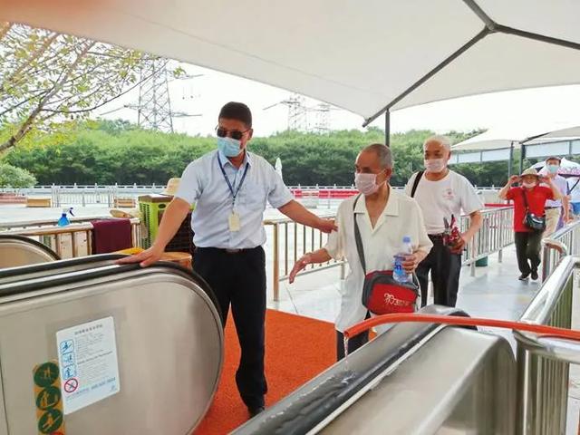 三峡大坝旅游区电梯入口处,园区管理员黎国军一边扶着刚入电梯口的游客王大爷上行,一边提醒后面的游客抓好扶手、注意脚下安全。烈日炎炎,坛子岭园区的室外温度一直维持在36摄氏度以上,为防游客在扶电梯扶手时烫伤,园区管理员们积极开动脑筋,在扶手旁加装水管,辅助降温。(文图:阮永红)