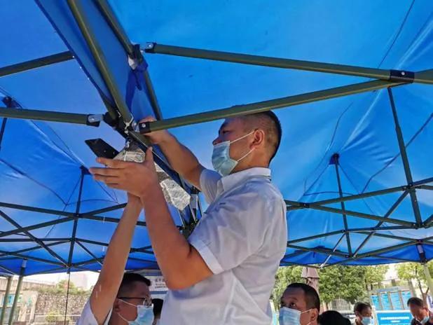 汛期,强降雨天气频繁,为避免游客在游客中心广场处等候查验健康绿码时被雨水淋湿,三峡基地发展公司旅游公司景区管理中心游客中心主管张洋带领部门同事在两个遮阳棚之间加装接水槽,将雨水引流。(文图:王昱霖)