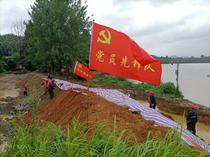 ▲ 7月26日,项目党支部联合各参建单位组织党员先锋队、青年突击队连续抢险8小时,在副坝前筑起两道抗洪防线。