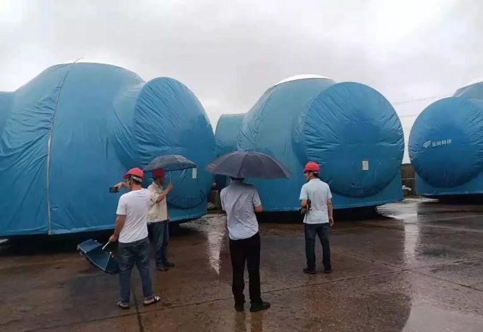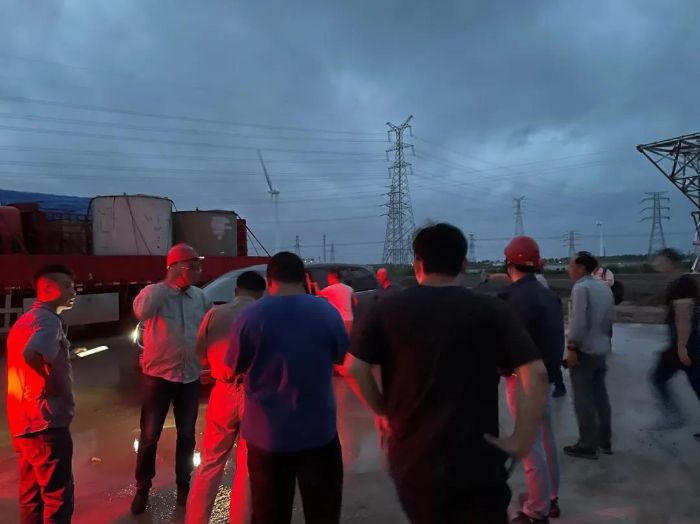 ▲ 大丰总承包项目部在“烟花”影响期间,对风机部件堆场进行防汛防台风措施落实情况检查。摄影:吴茂树
