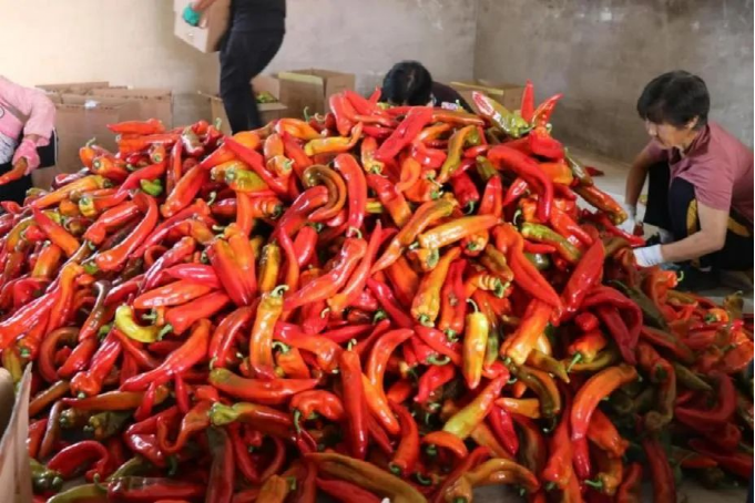 ▲ 辣椒收购点内,新鲜采摘的辣椒等待打包