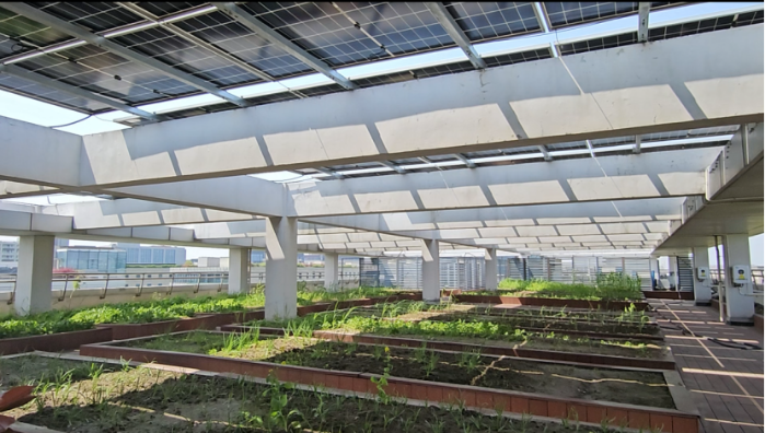 ▲楼顶花园上的光伏组件 摄影:王璐