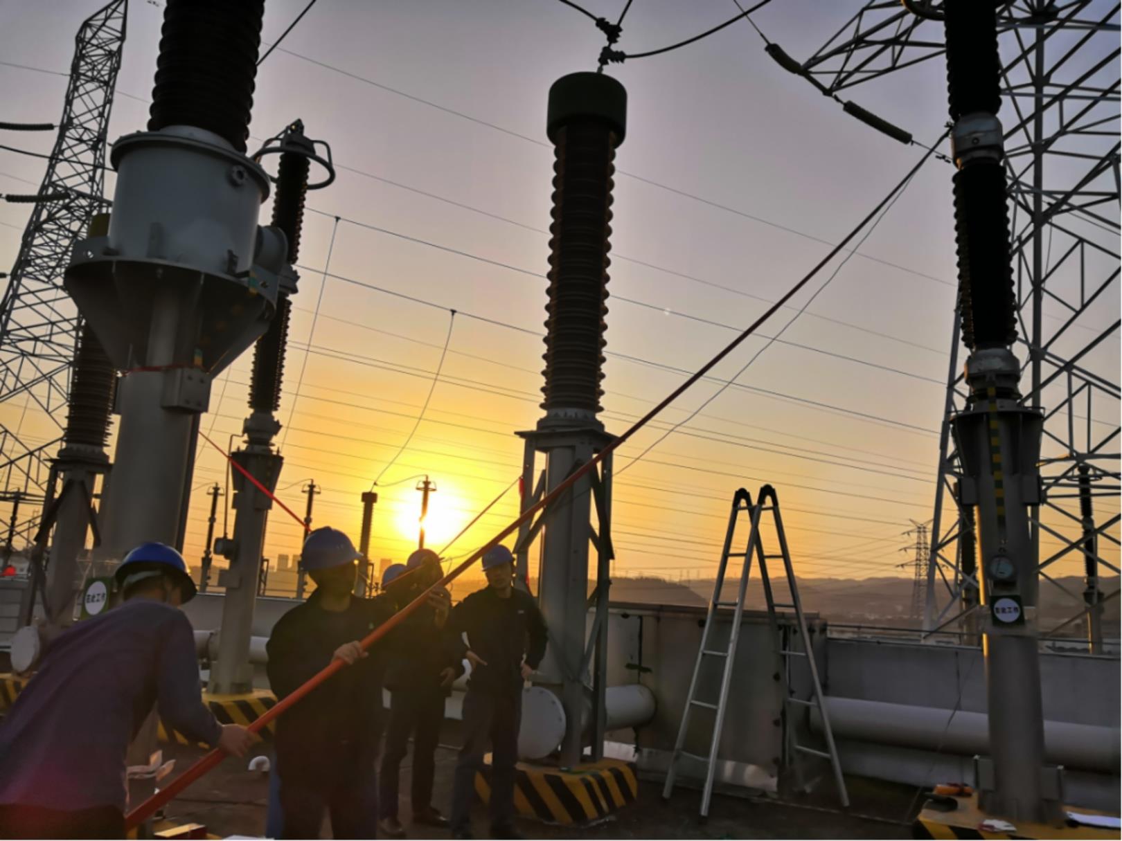 ▲ 夕阳下,葛洲坝电厂发电分部发电高压试验组在500千伏厂房顶进行避雷器试验。摄影:王灿霞