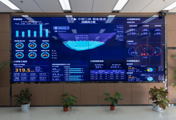具体而言,大坝中埋设的5774支温度计、75347米的测温光纤、数千支监测仪器,用于感知气温、风速、温度、应力、应变等信息,可以实现混凝土生产、运输、浇筑、运行的全生命周期监控,对施工进度、质量进行可视化分析。