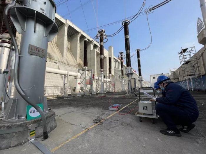 ▲ 三峡电厂员工在右岸厂房顶进行出线高压试验。摄影:王晨雷