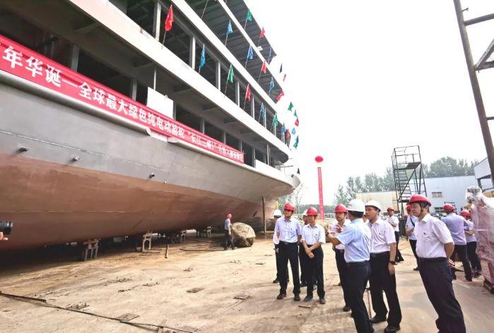 ▲三峡集团、宜昌交运集团以及国家电网代表共同见证全球最大绿色纯电动游轮“长江三峡1”号船体建造完成。摄影:胡鹏