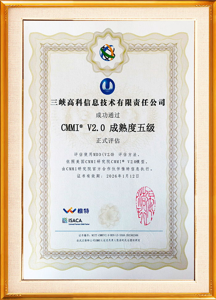 此次成功认证标志着三峡高科在过程组织能力、软件研发能力、项目管理能力、方案交付能力等方面已达到国际最高成熟度标准,可以为用户提供更成熟的行业解决方案和更优质高效的服务,是三峡高科推进研发管理体系规范化征程上的重要里程碑。(三峡高科供图)