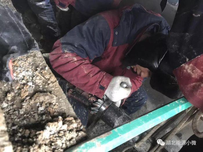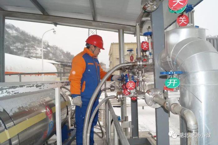 12月27日,保康地区迎来中雪,因冬季用气量大,而室外气温低,LNG气化器底部及附近结冰严重,为了确保设备运行安全,确保气化器的正常气化能力,湖北省天然气保康公司生产运行人员及时除雪铲冰。(摄影:庞斌)