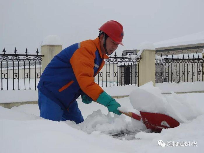湖北省天然气公司仙人渡站徐玉龙第一时间清除消防水池进水口盖板积雪。(摄影:王浩)
