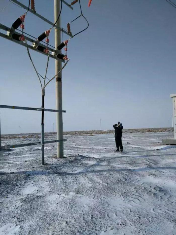 不畏凛冬,哈密苦水风电场运行人员坚持户外巡检工作,主要对场内八条集电线路的引下线、避雷器接地线、隔离开关牵引杆等进行逐一检查。
