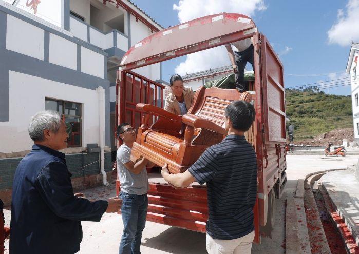 在移民搬迁指挥车的调度下,车队一分为二,向乌东德镇新村移民安置点和皎西镇移民安置点出发。车队进入皎西镇移民安置点,震耳的鞭炮声响起来。皎西镇政府工作人员和一批民兵帮助移民搬卸家具行李。