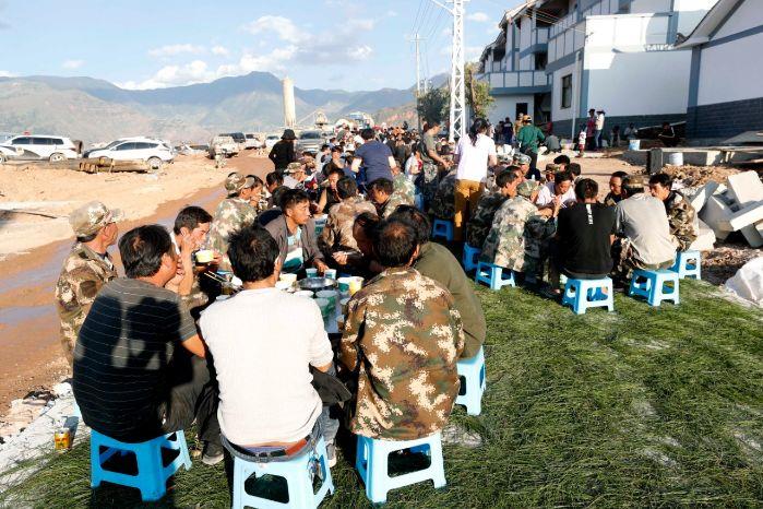 当日上午11时30分,皎平渡镇政府工作人员在乌东德镇与皎西镇交叉路口等待着搬迁车队,他们为移民群众准备了饭菜。帮助搬迁的工作人员把一盒盒饭菜送到移民手中,搬迁移民和工作人员就在路边吃了午餐。
