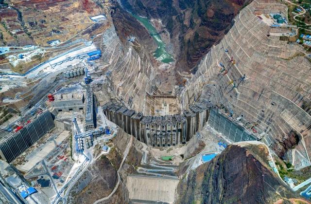 航拍白鹤滩水电站工程大坝上游面