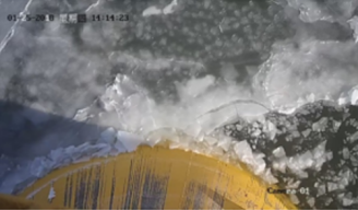 ▲ 2018年1月庄河Ⅲ海上风电场的监控画面,海冰在抗冰锥结构的作用下被击碎(三峡能源供图)