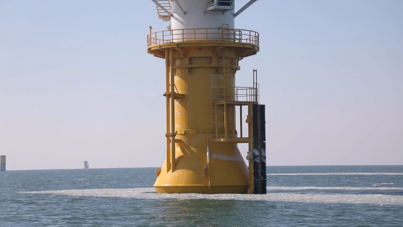 ▲ 庄河Ⅲ海上风电场的海冰与风机的抗冰锥结构(三峡能源供图)