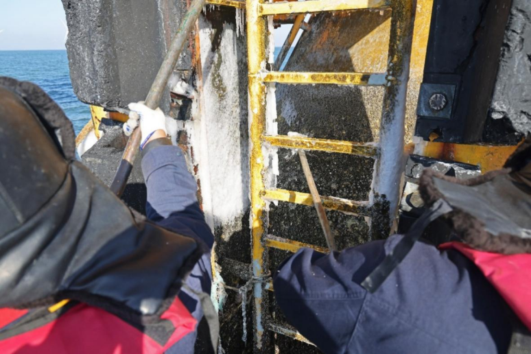 ▲ 运维人员在铲除海上升压站上行爬梯上的冰(左凌仁供图)