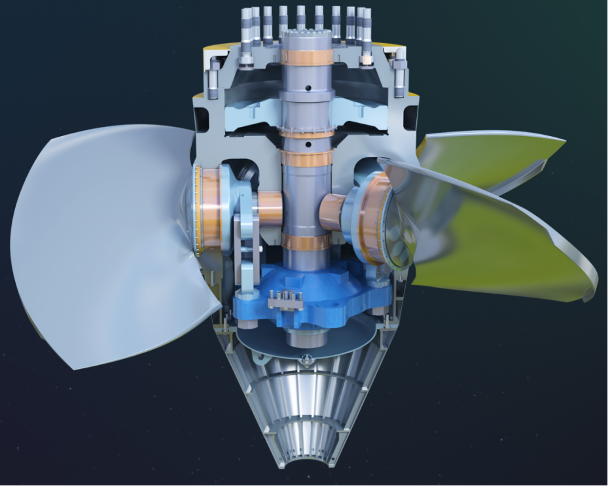 ▲轴流转桨式水轮机转轮剖面图示意(葛洲坝电厂供图)