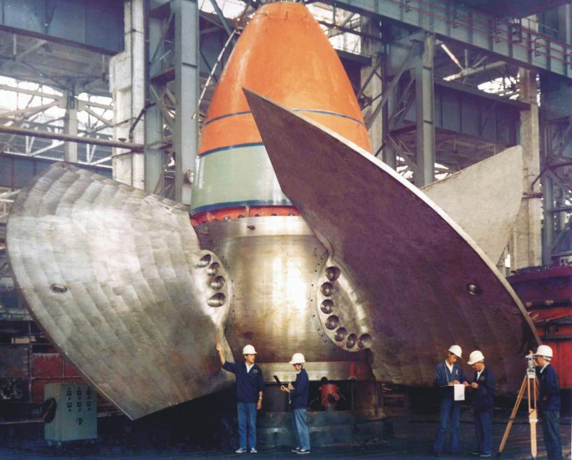 ▲1979年,由东方电机自主研制的葛洲坝水电站17万千瓦轴流转桨式水轮发电机组制造成功。(东方电机供图)