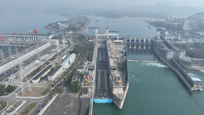 ▲ 航拍葛洲坝船二号船闸检修现场 摄影:陈臣