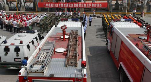 | 6月28日上午,三峡枢纽2011年氨泄漏应急救援实战演练在三峡大坝右岸84拌和楼举行。(华吟江 摄) |