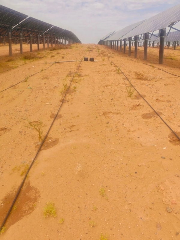 在库布其大基地光伏一期场区,黑色滴灌管道沿光伏阵列蜿蜒伸展。管壁上密布的滴头正渗出晶莹水珠,精准浸润着每一株植物的根系。
