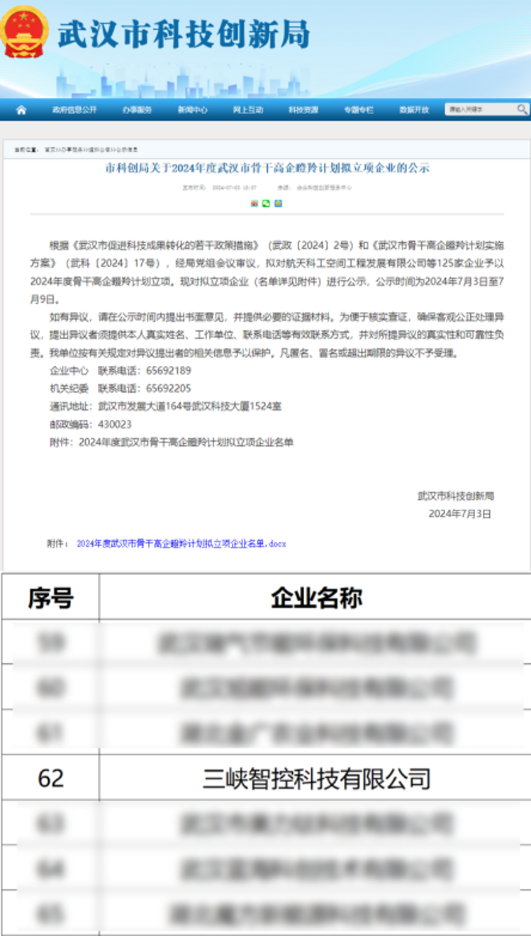 2024-07-17 7月3日,武汉市科技创新局公布2024年度武汉市骨干高企瞪羚计划拟立项企业名单,三峡智控成功入选“2...