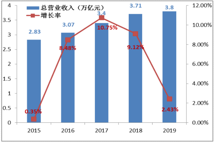 ▲2015-2019年“500强”百亿企业营业收入及增长率