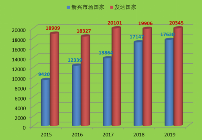 ▲2015-2019年“500强”企业中新兴市场国家与发达国家企业总营业收入(亿元)