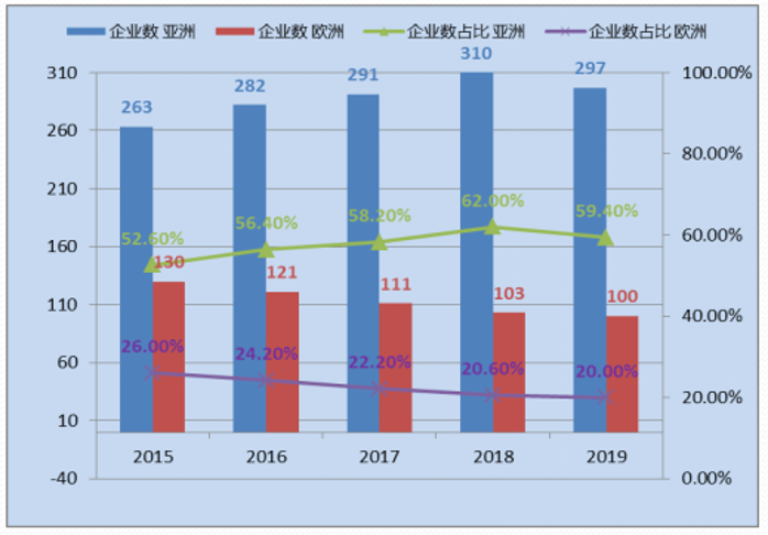 ▲2015-2019年“500强”亚洲、欧洲企业数及其占比对比