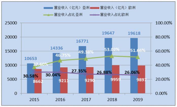 近几年,欧洲企业总营业收入处于缓慢增长、停滞甚至萎缩的状态,2019年为9897亿元(2018:9959亿元),比2018年减少62亿元(2018:+669亿元);占比26.06%(2018:26.88%),减少0.82个百分点(2018:-0.47)。亚洲方面,2019年入选企业总营业收入为19618亿元(2018:19647亿元),比2018年减少29亿元(2018:+2876亿元),占“500强”总营收额的51.66%(2018:53.02%),再次超过半数。