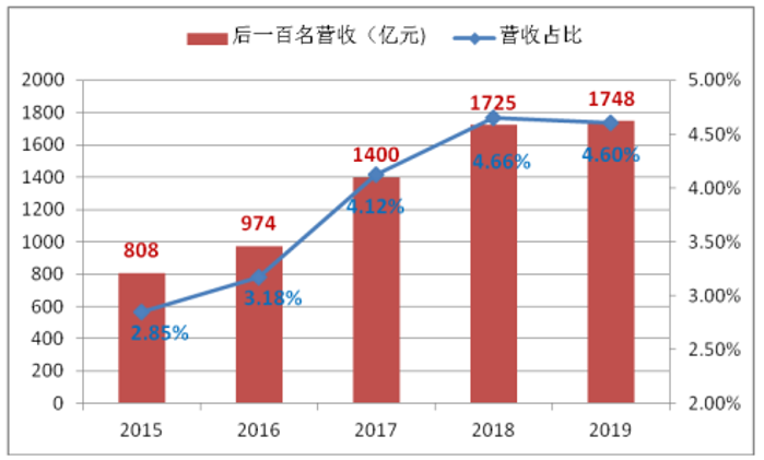 ▲2015-2019年“500强”后百名企业营收及营收占比情况