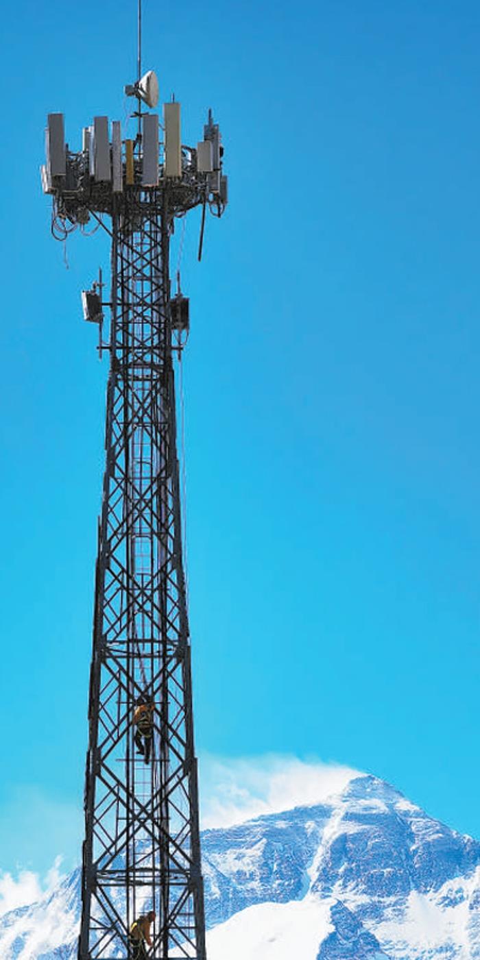 我国信息通信水平快速提升,5G基站总量占全球比重达60%以上,居全球首位。图为西藏自治区日喀则市,通信工程人员在给珠峰大本营的5G基站做维护。
